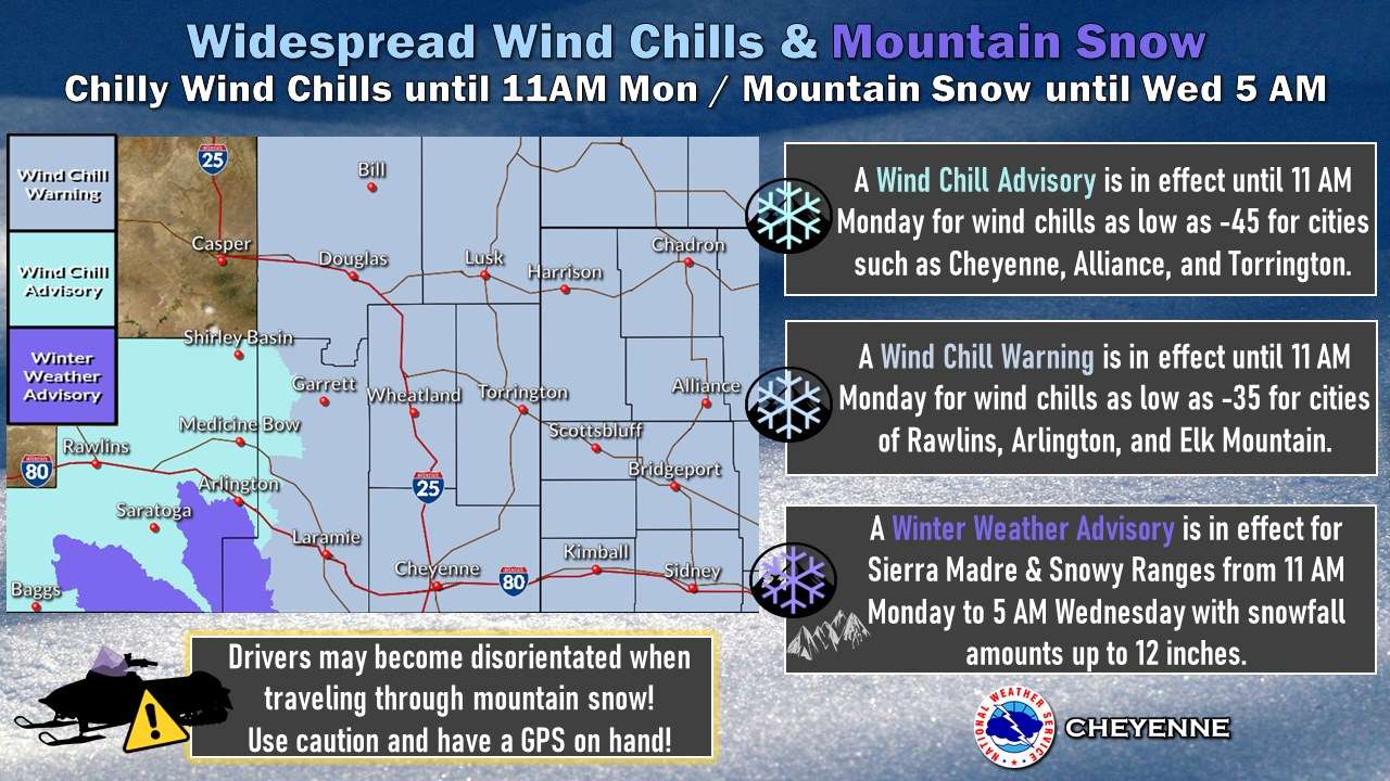 Areas such as Rawlins, Arlington, and Elk Mountain can expect up to -35 wind chills until Monday morning.
