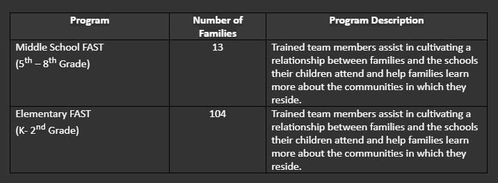 FAST is an internationally-acclaimed program that supports the family bonding necessary for children to thrive. The program is designed to build the relationships between families, schools, and the communities in which you reside. Built on evidence-based practices and rigorously tested, FAST: