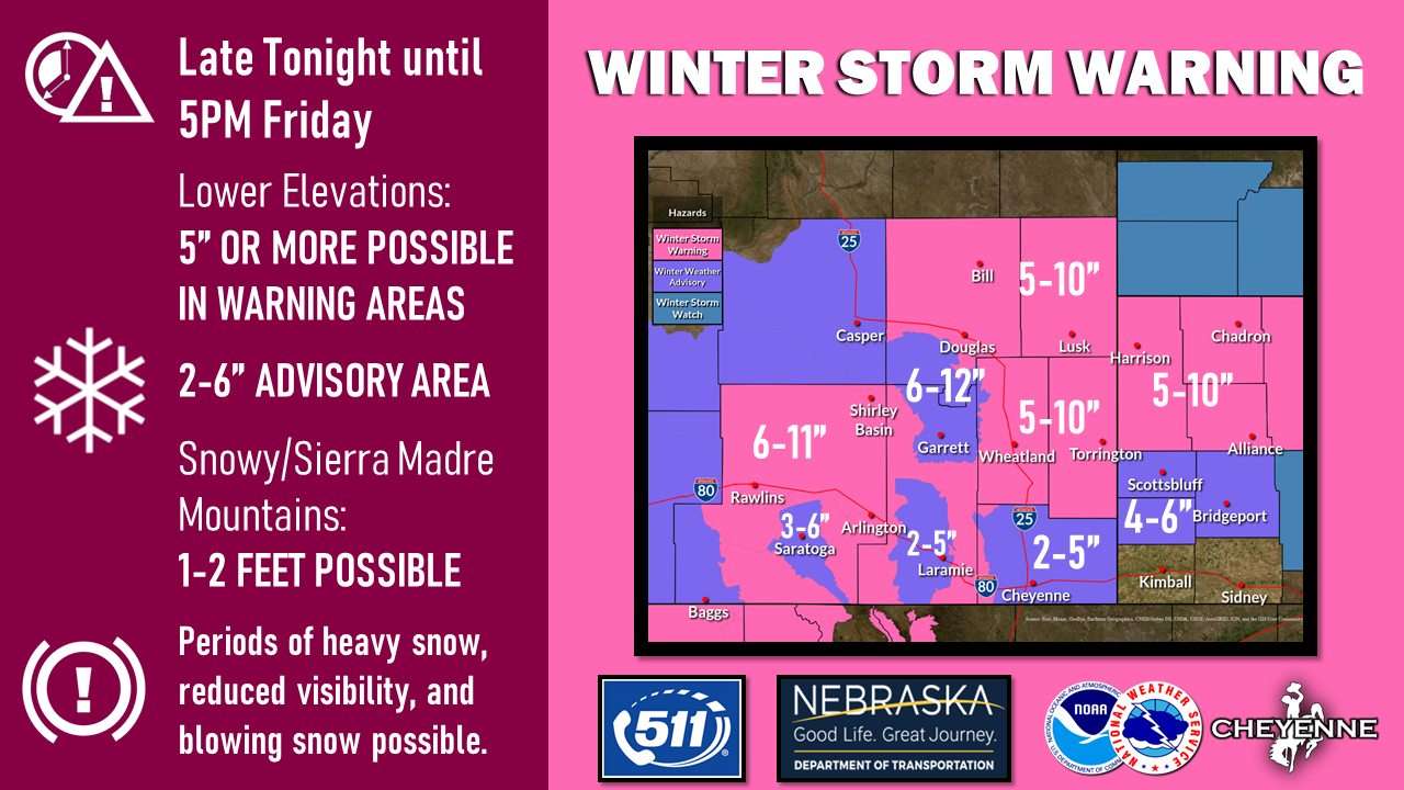 Accumulations will vary across our area. In the warning areas (pink), 5-10” of snow accumulation is anticipated in east central Wyoming and the northern Nebraska Panhandle. 6-11” is expected in Carbon County. The mountains are expected to receive 1-2 feet.