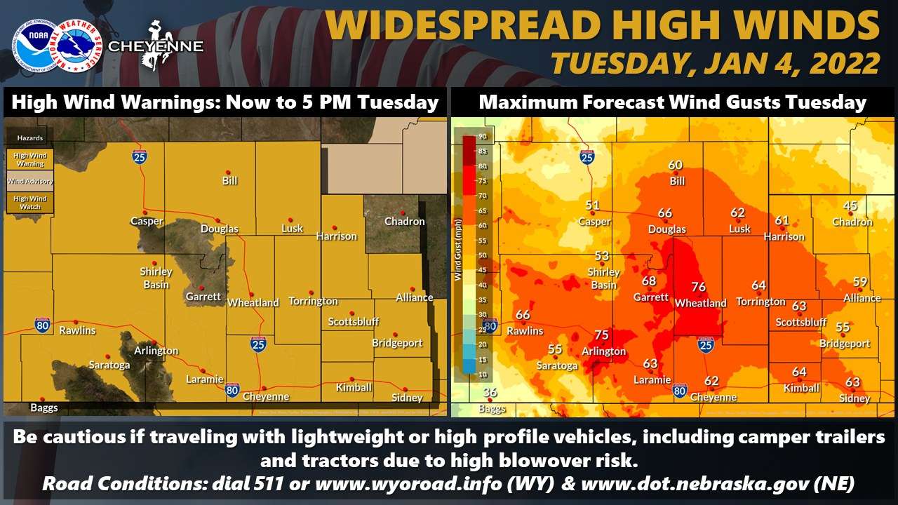 Wind prone areas of southeast Wyoming (Arlington, south Laramie Range and Bordeaux) could see wind gusts up to 75 mph Tuesday with 60-70 mph elsewhere. Blowover risk will be quite high Tuesday across much of the area. A brief lull in the winds will occur Tuesday evening, before picking back up on Wednesday.