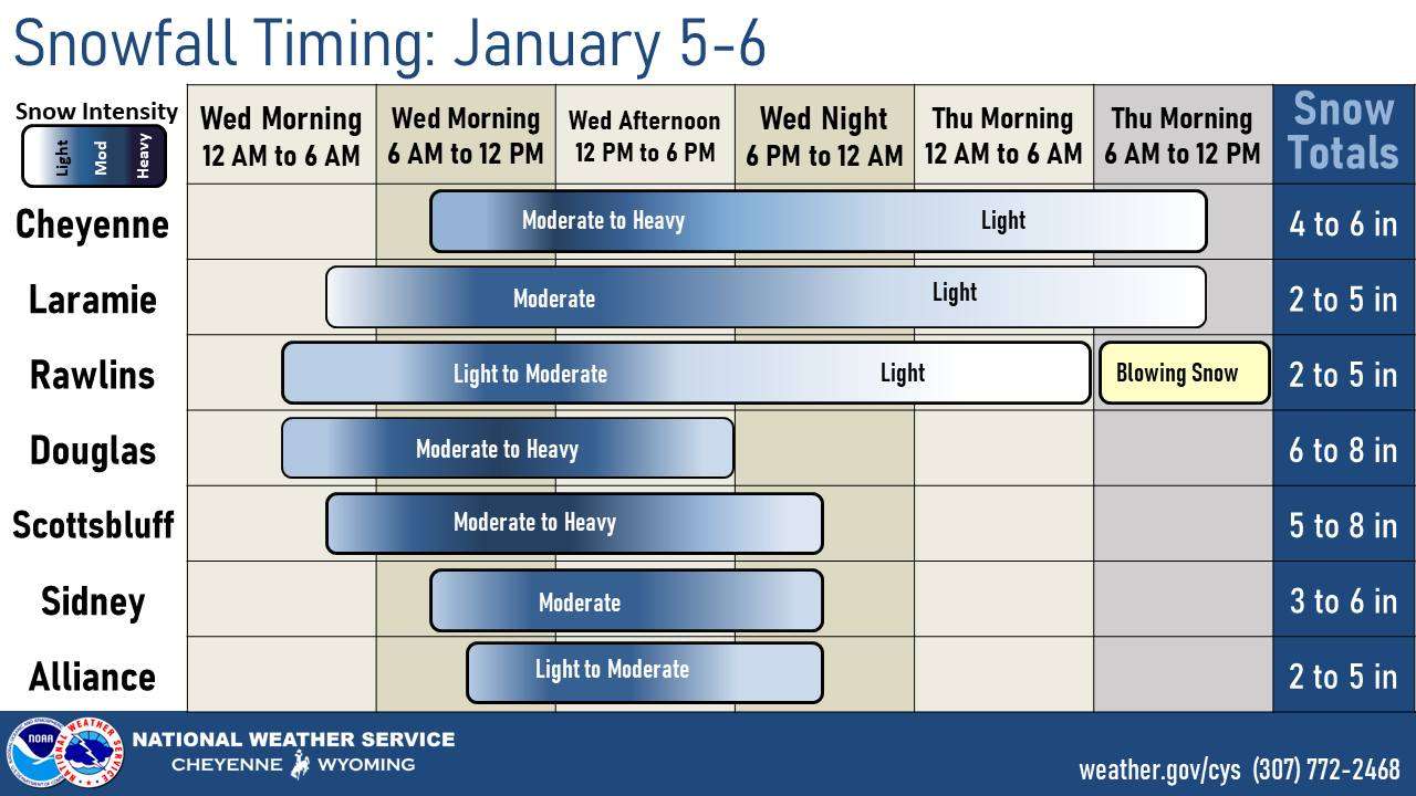 Most of the snowfall is expected from the mid morning through the mid afternoon tomorrow, but light snow could linger in southern Wyoming through Thursday morning.