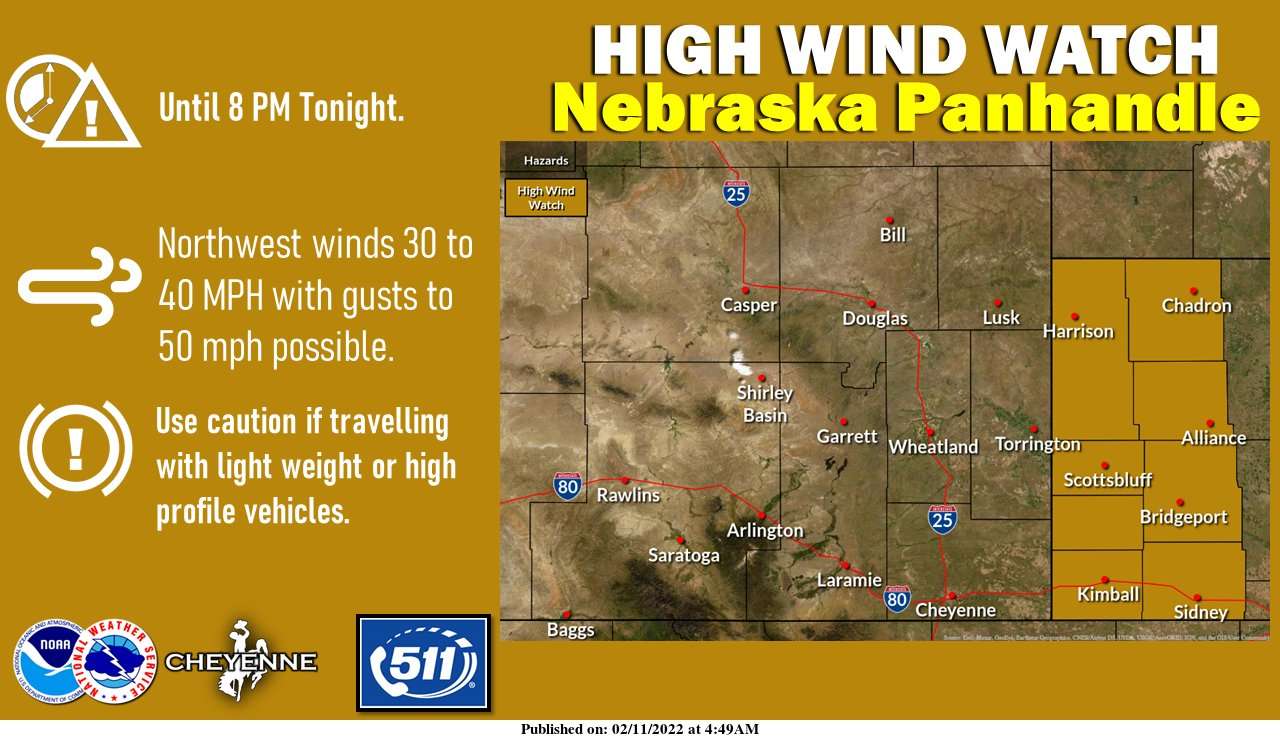 A High Wind Watch is in effect through 8 PM this evening for the Nebraska Panhandle.