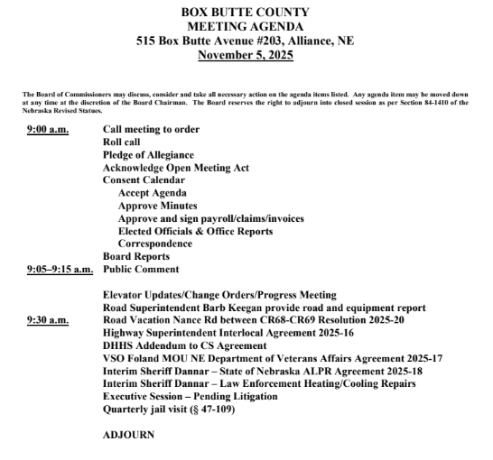 Box Butte County Commissioner Meeting Agenda for Nov. 5