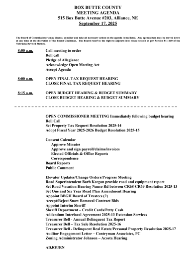 Box Butte County Meeting Agenda for Wednesday, Sept. 17
