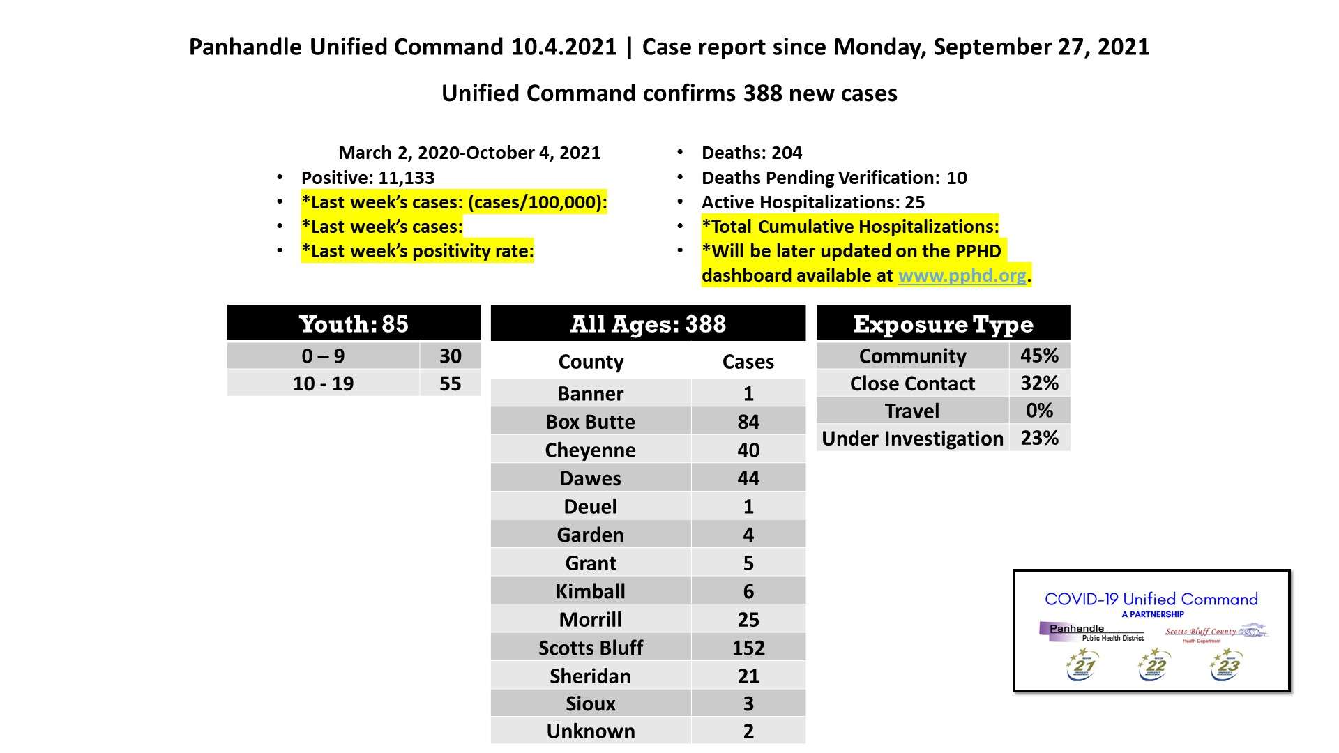 Unified Command confirms 388 more cases of COVID in the Panhandle since last reporting on Monday, September 27.