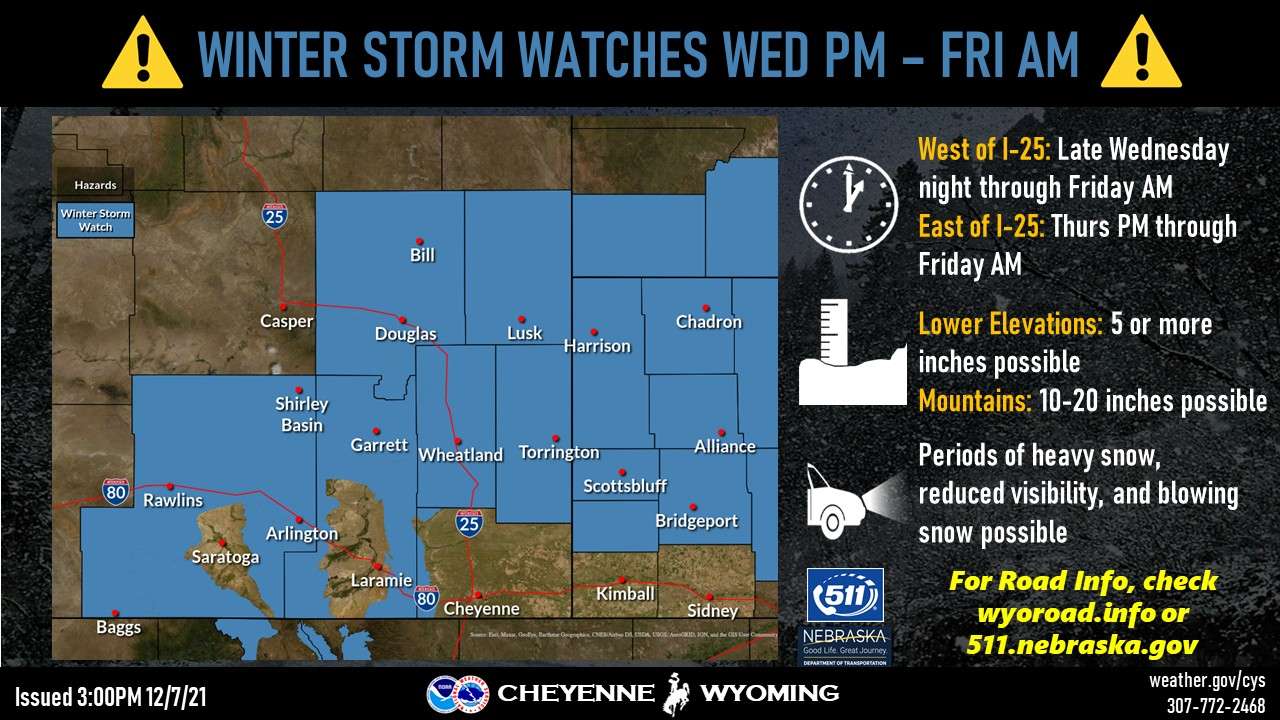 Total accumulations of 5 or more inches are possible in the lower elevations of the watch area, with 10-20 inches in the Sierra Madre and Snowy ranges. Uncertainty is greater for the I-80 corridor at this time, so please stay tuned for the latest!