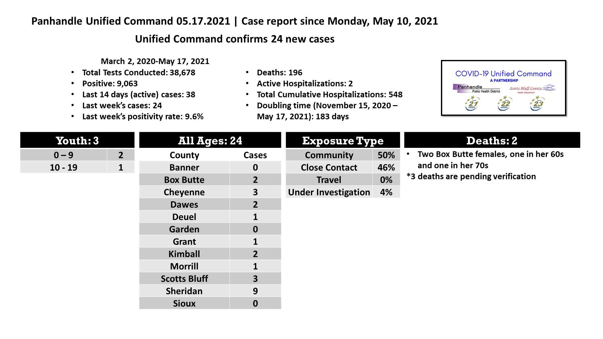 Unified Command confirms 24 more cases of COVID in the Panhandle since last reporting on Monday, May 10. The investigations are underway, all close contacts will be quarantined.