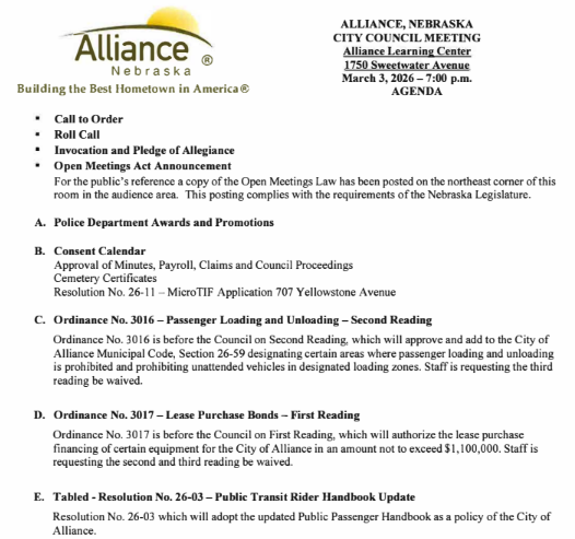 Alliance City Council Meeting Agenda, March 3