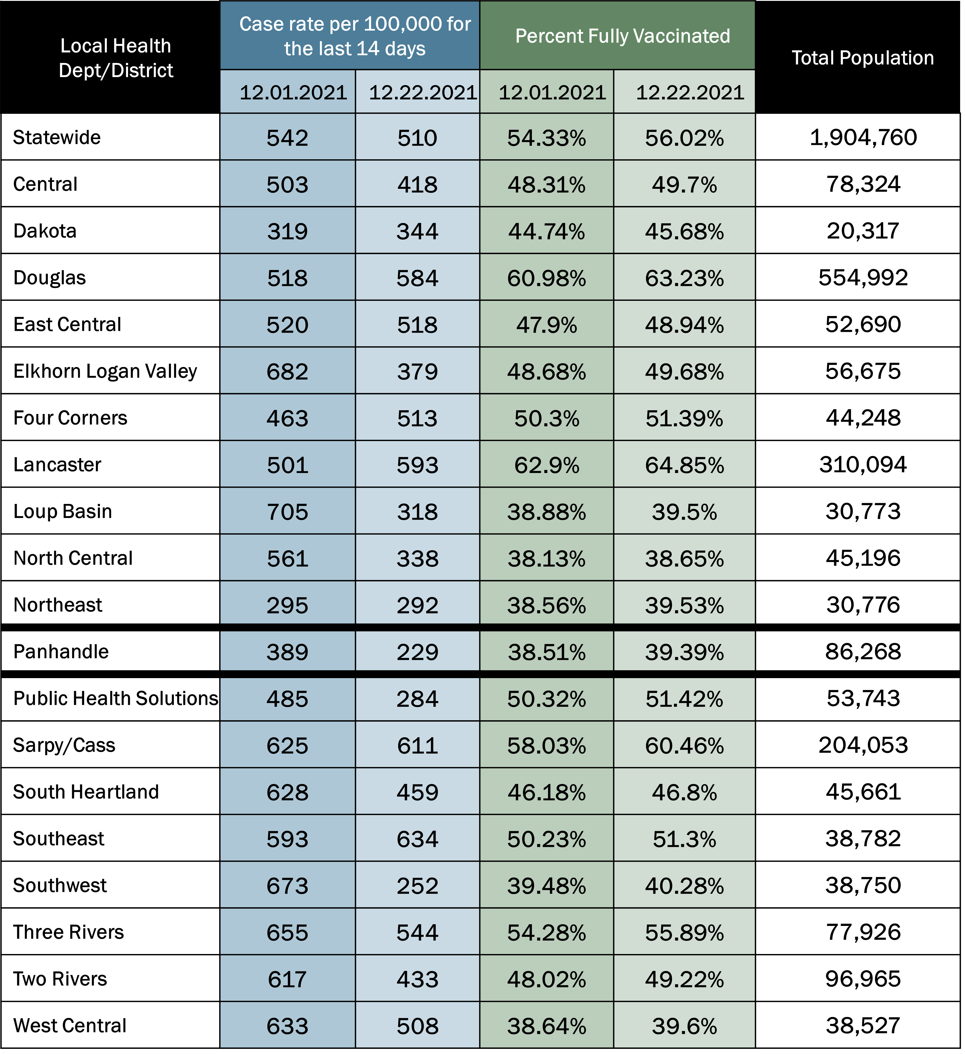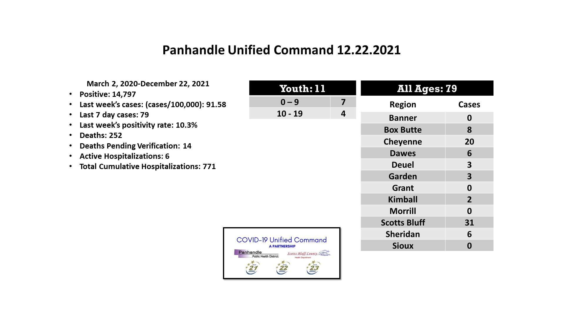 “For anyone age 5 and older, please get vaccinated. With the looming concern of the Omicron variant and the anticipated therapeutic gap, vaccination and getting boosted will ideally prepare Panhandle residents for safer outcomes when this variant is identified in the area and help keep hospitalizations lower,” said Kim Engel, Panhandle Public Health District Director.