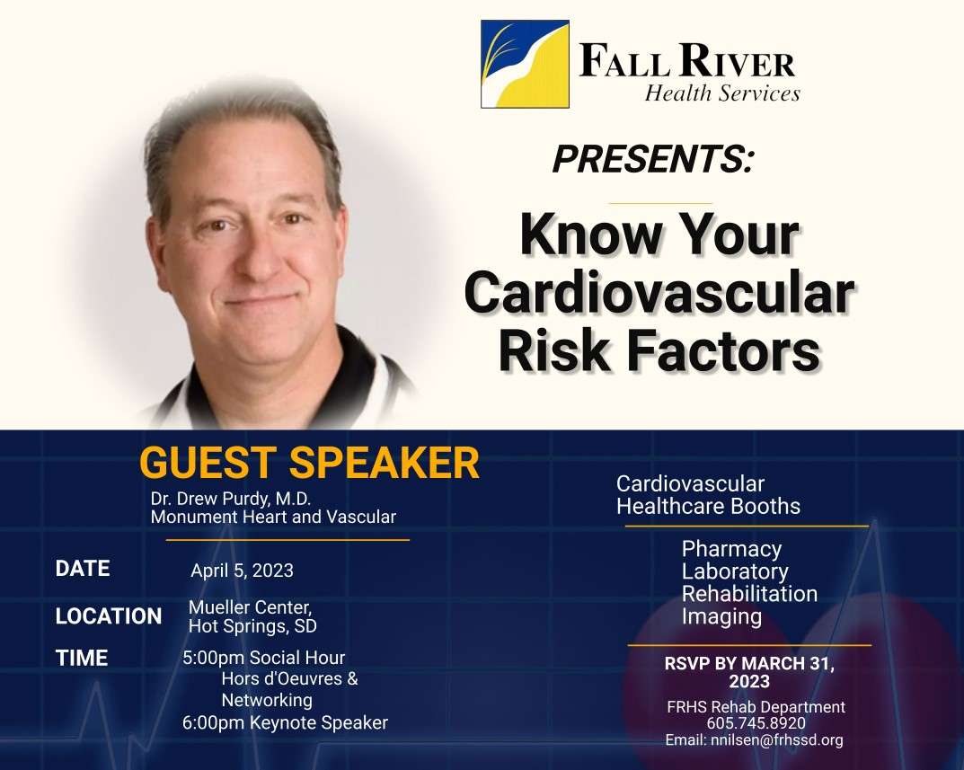 Plan on attending Fall River Health Services as we host a free community awareness event focused on cardiovascular risk factors on Wednesday, April 5th, at the Muller Center in Hot Springs starting at 5pm social and the featured Keynote speaker, Dr. Drew Purdy from Monument Heart & Vascular Center, Dr. Purdy will be addressing “ Risk Factors for Heart Disease and Stroke, such as Diabetes, Obesity, Smoking, High Cholesterol, High Blood Pressure and Stress.