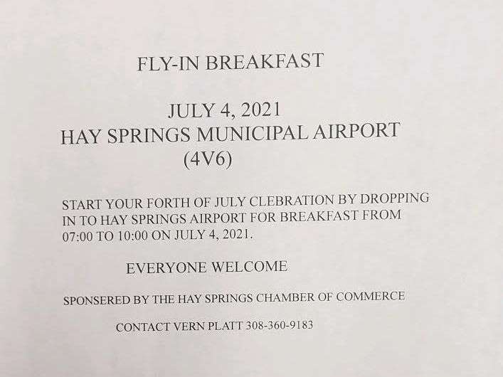 The Hay Springs Chamber of Commerce and Hay Springs Municipal Airport will hold a fly-in breakfast on July 4 from 7 a.m. - 10 a.m.