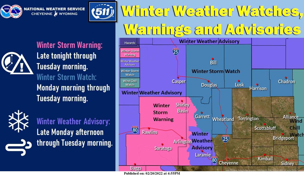 A Winter Storm Warning (pink) is in effect from late tonight through Tuesday morning for Carbon County and far western Albany County, including Rawlins, Saratoga, Arlington and Shirley Basin.