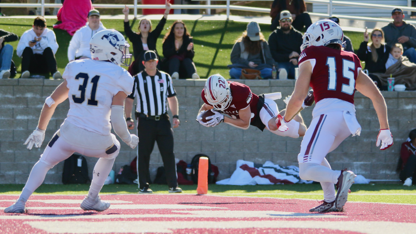 About four minutes later, the Eagles went 60 yards for their second touchdown. A 22-yard pass from Hamilton to Tommy Thomas launched the drive. Two plays later Jeydon Cox carried a short pass 24 yards into the end zone, although he was scrambling to stay on his feet much of the way after nearly being tripped up by a Mines defender soon after he'd caught the ball. As he neared the goal line, Cox finally gave up and somersaulted into the end zone.