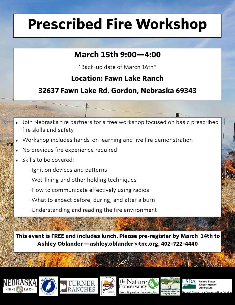 The will be a Prescribed Fire Workshop on March 15 in Gordon located at Fawn Lake Ranch.