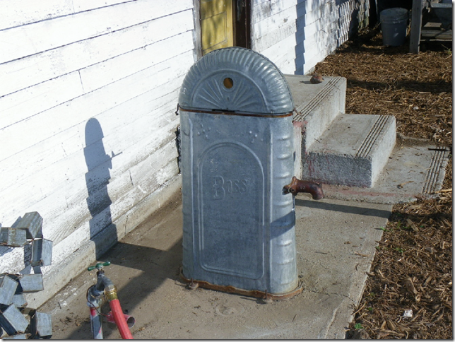 The cistern pump at Dobby’s was one style used to bring water up from the underground tank. A group of cups are attached to a chain, and they bring the water up to be spilled into a funnel, which then comes out the spout on the front to pour into pitchers. A group of cups on a chain are in this cistern, and another chain of cups hangs on the church wall.