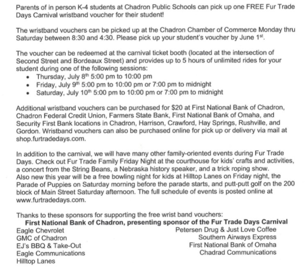 Chadron K-4 students can receive 1 free Fur Trade Days carnival wristband