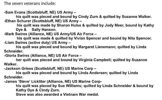 ALLIANCE, Neb. - Seven veterans were honored and wrapped with Quilts of Valor in a ceremony Saturday, Feb. 21, 2026 at the Alliance VFW lead by Kathy Dye of Panhandle Blocks, the local chapter of the Quilts of Valor Foundation. The American Legion Post No. 7 and American Legion Riders Panhandle Chapter No. 43 also assisted.