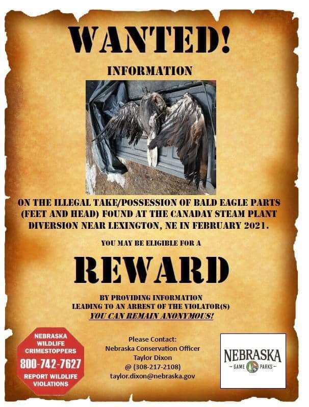 Game and Parks says the feet, head and feathers were taken from the body of a bald eagle at the Tri-County Canal Canaday Steam Plant river diversion sometime in February of 2021.