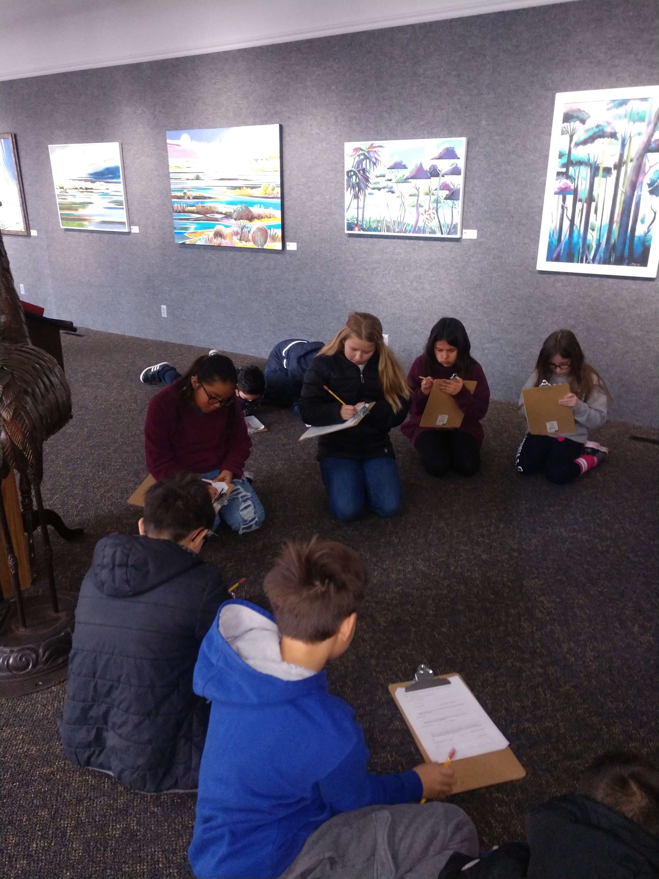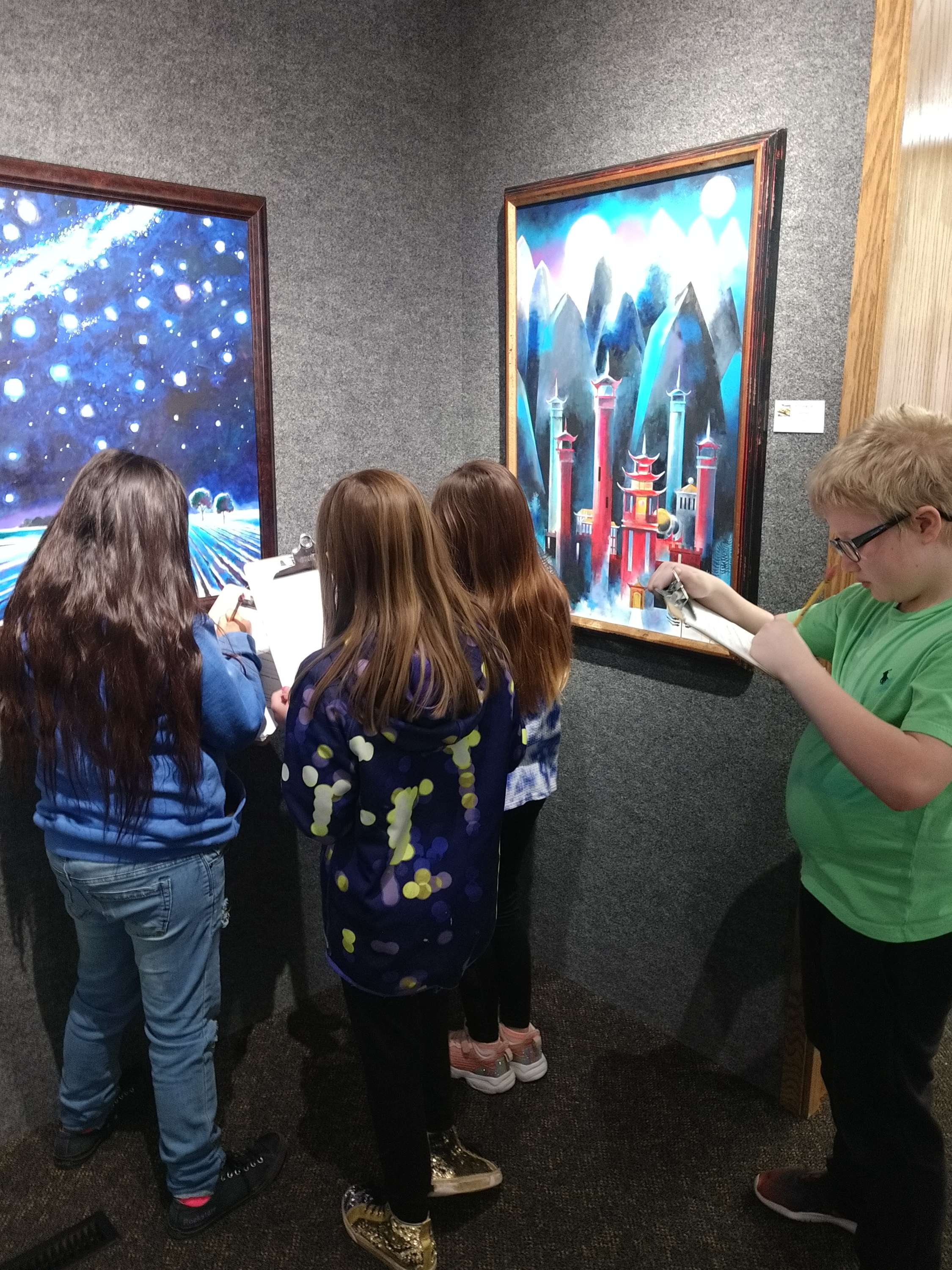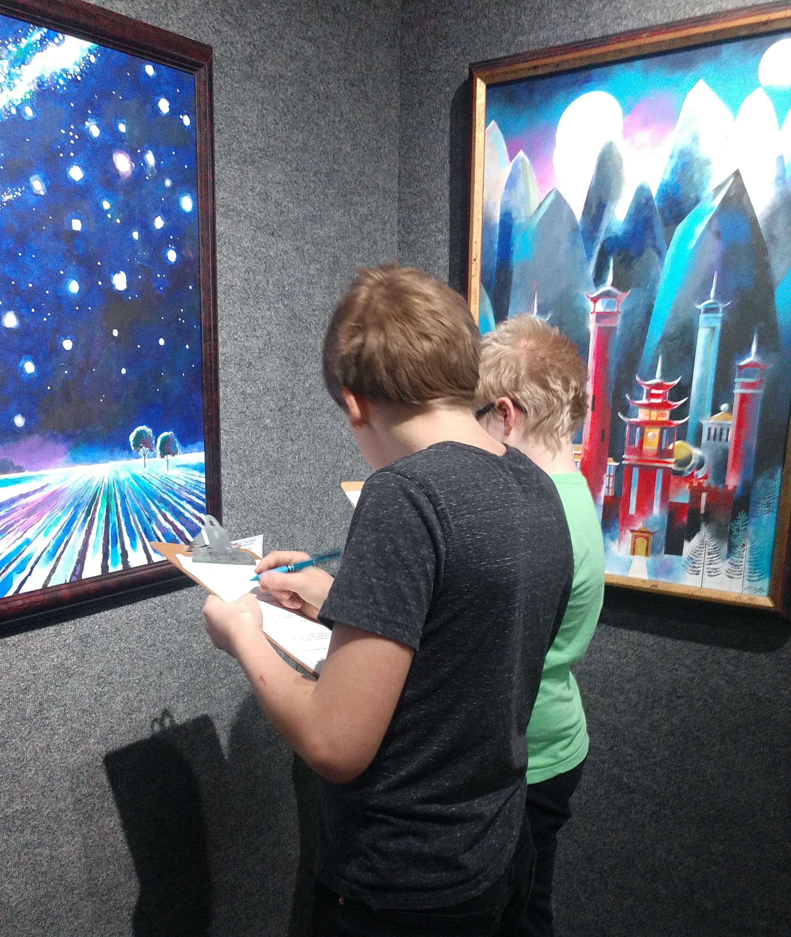 Their artwork is a part of the Wonders annual exhibit until February 19. Over the course of three days, three 4th grade classes tour the upper gallery exhibit, pretending to be art judges. They review their favorite pieces, looking at art elements and detailing other specific items including creating their own drawings by choosing a favorite part of the piece. They learn about what it means to be an artist in the real world and what a professional exhibit is comprised of.
