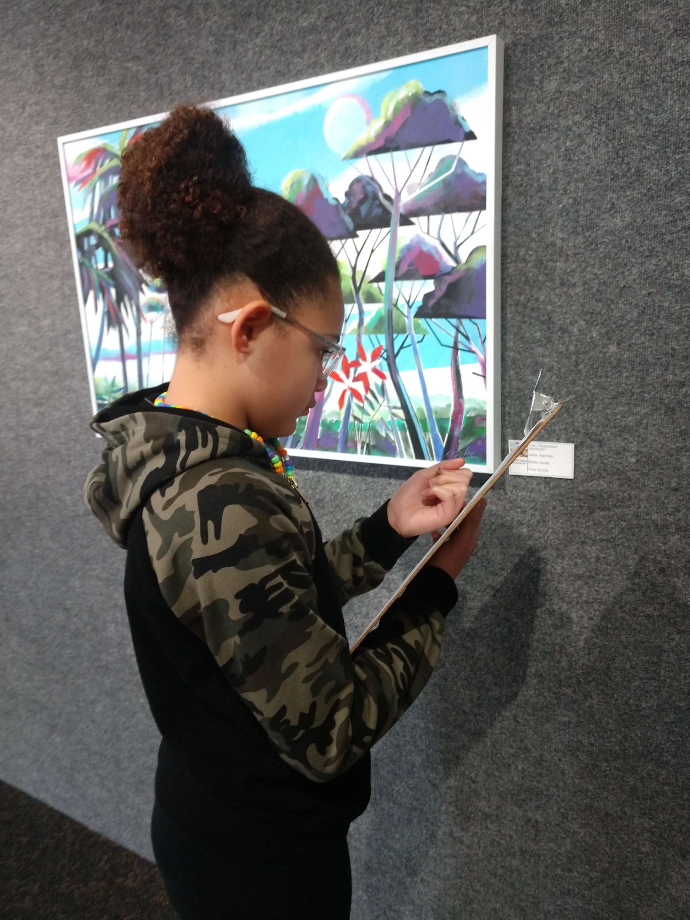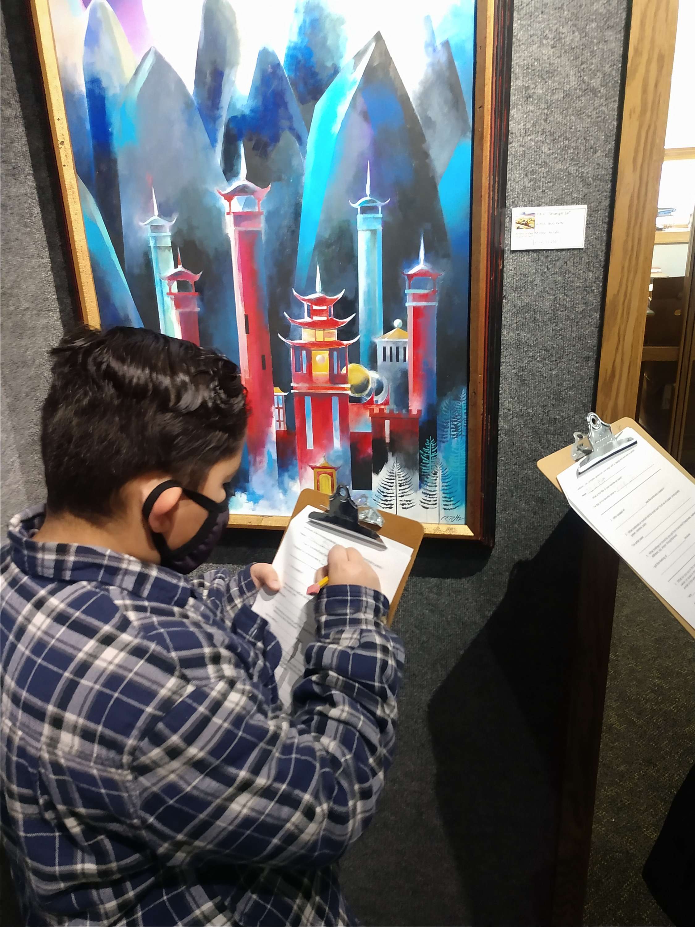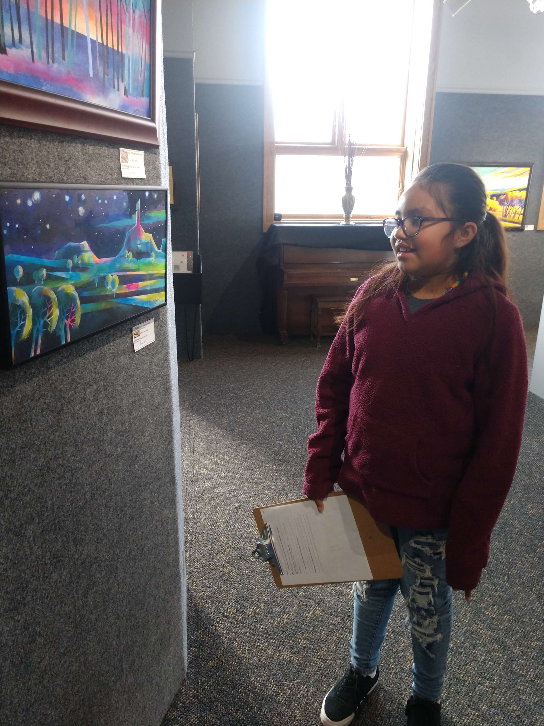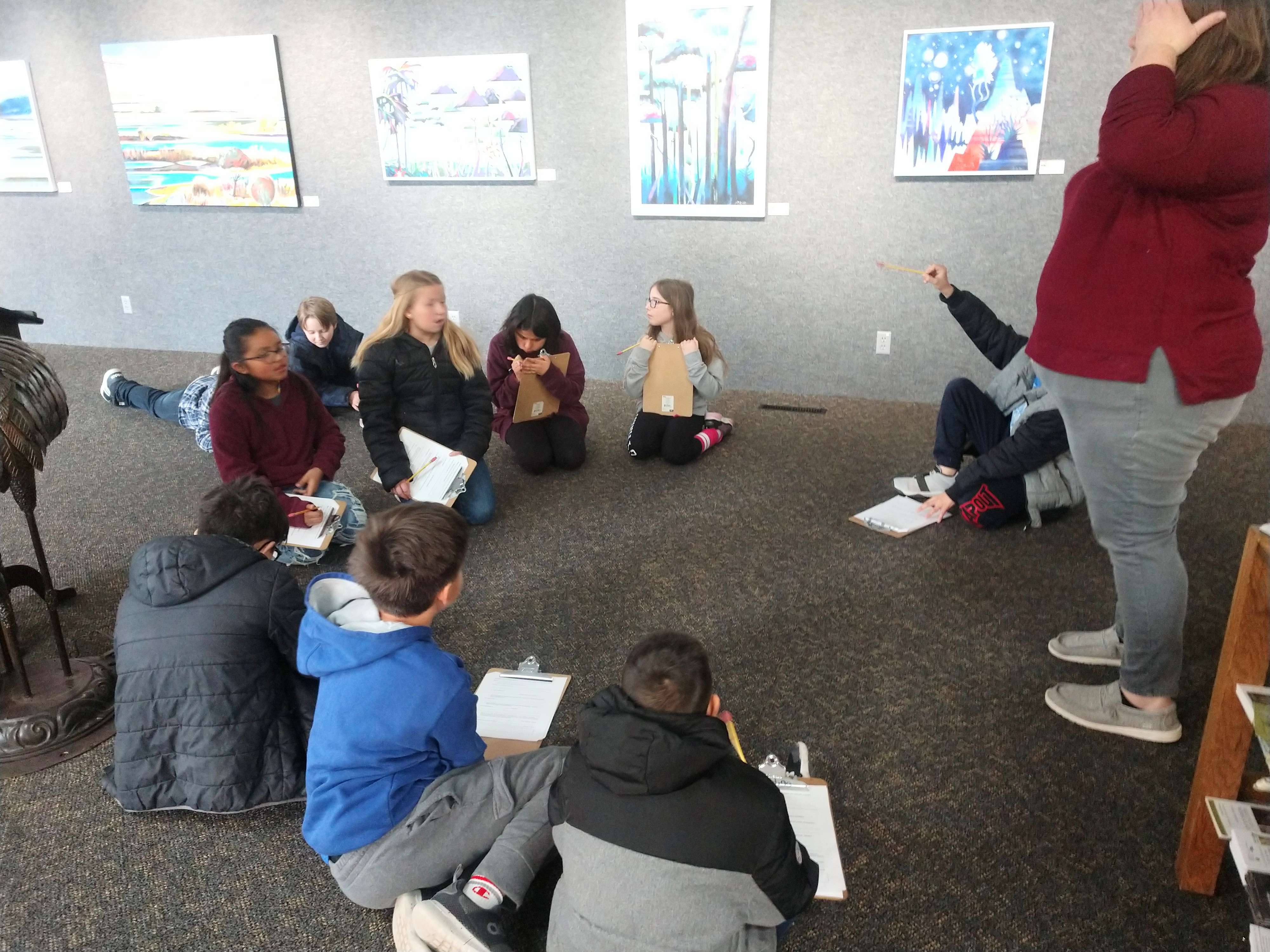 Their artwork is a part of the Wonders annual exhibit until February 19. Over the course of three days, three 4th grade classes tour the upper gallery exhibit, pretending to be art judges. They review their favorite pieces, looking at art elements and detailing other specific items including creating their own drawings by choosing a favorite part of the piece. They learn about what it means to be an artist in the real world and what a professional exhibit is comprised of.