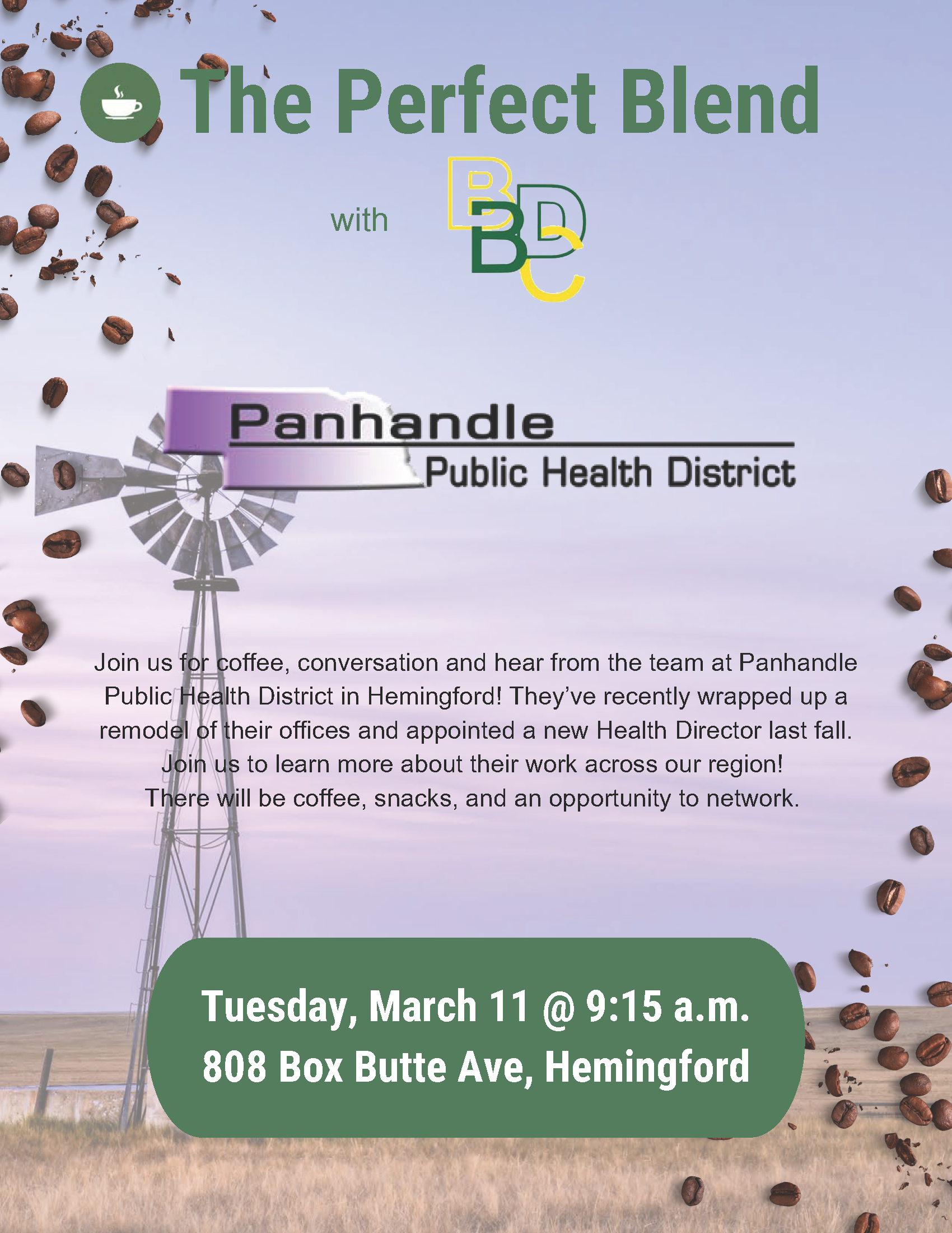 Box Butte Development Corporation (BBDC) invites the community to its next Perfect Blend event on Tuesday, March 11, at 9:15 a.m., hosted by Panhandle Public Health District (PPHD) at 808 Box Butte Ave, Hemingford. This monthly networking event provides an opportunity for businesses and organizations to share updates and connect with the community in an informal setting over coffee and snacks.