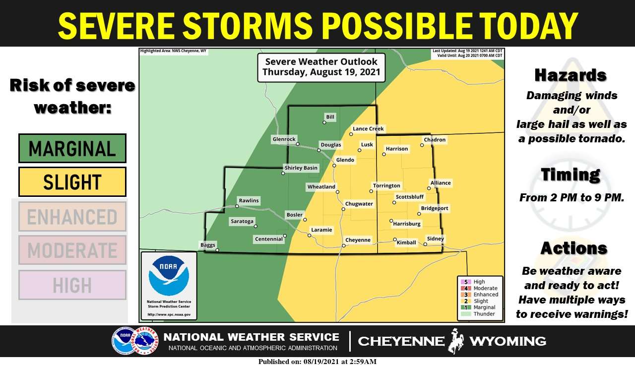 There is a slight risk (yellow shading) of severe thunderstorms this afternoon and evening to the right of a line from Lance Creek to Bosler, with a marginal risk (dark green shading) for the rest of southeast Wyoming.