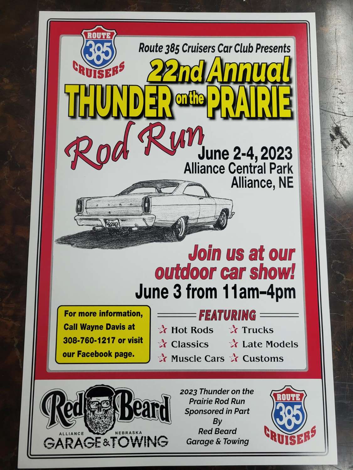 The Route 385 Cruisers Car Club will host the 22nd Annual "Thunder on the Prairie Rod Run" car show in Alliance on June 2- 4 at Central Park.
