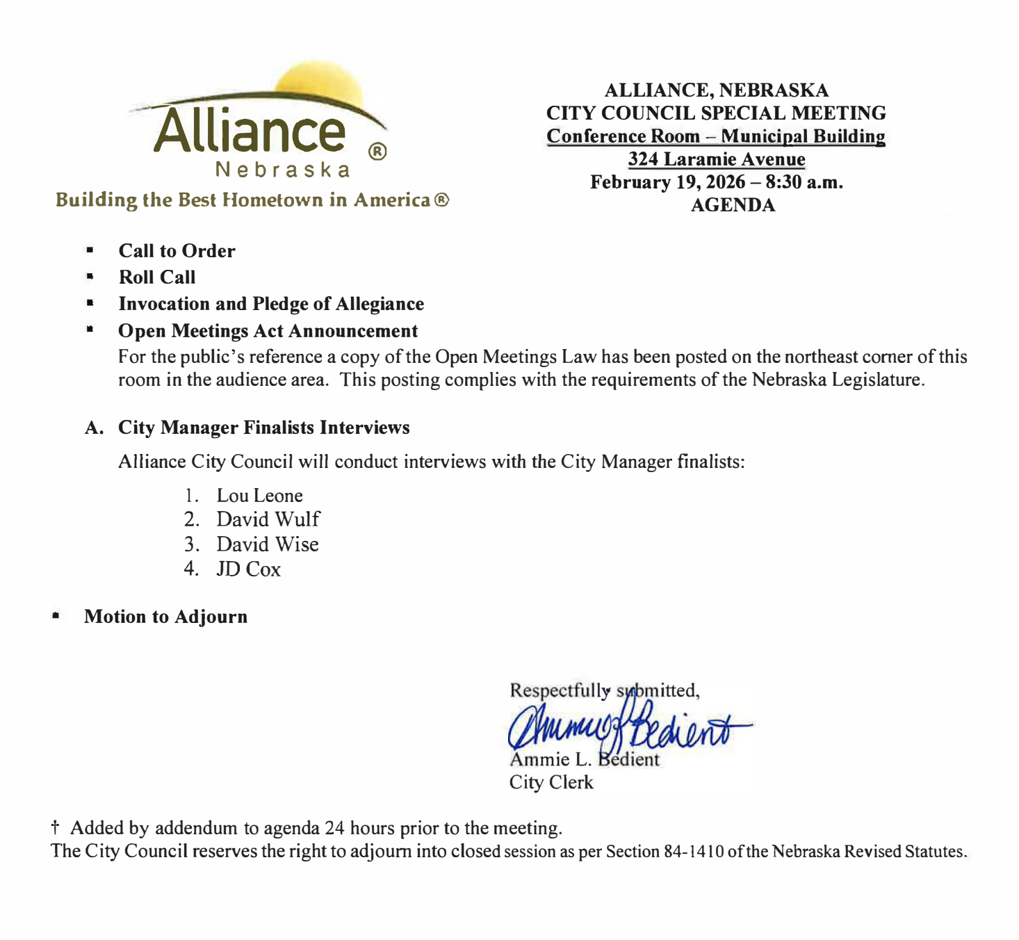 Alliance City Council Special Meeting Agenda, Feb. 19
