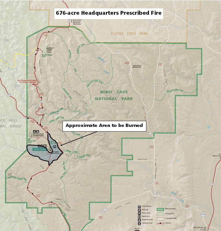 WIND CAVE NATIONAL PARK, S.D. – The 676-acre Headquarters Prescribed Fire, the subject of an October 15 press release, is planned for Saturday, November 6. Conditions are currently predicted to be within prescription, and ignition is planned to begin mid-morning. The media is invited to cover this event.