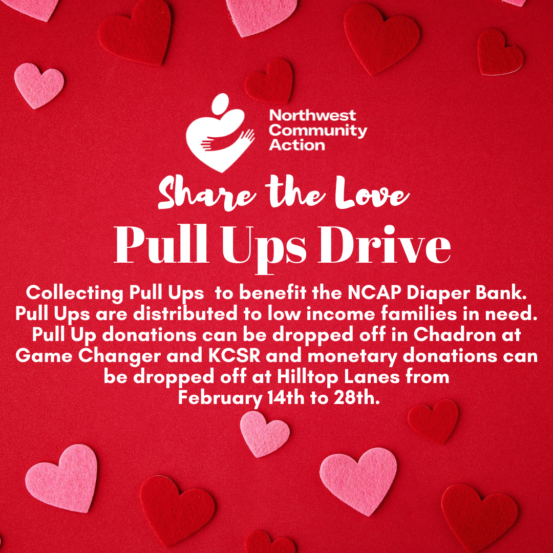 Pull Up donations can be dropped off at KCSR or Game Changers and monetary donations can be dropped off at Hilltop Lanes. Our current greatest need is Pull Ups for both girls and boys in size 4t-5t. Any donation, big or small, can make an impact on a child in need. We also accept open or partial packages – as long as they are clean and dry we can put them to good use. All pull ups and monetary donations collected through this drive will benefit the families we serve in Chadron.