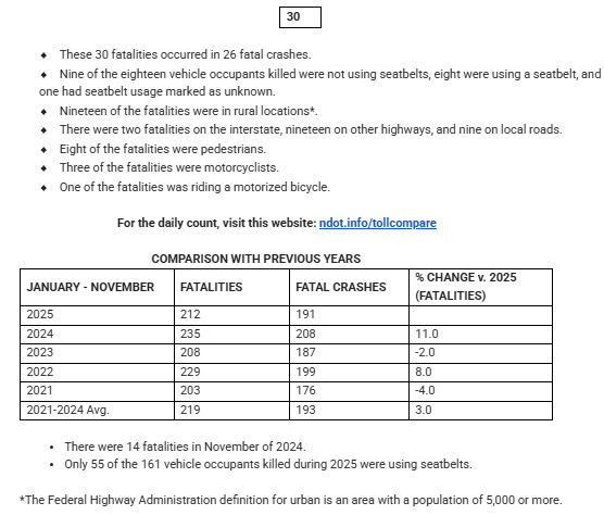 Lincoln, Neb. — During the month of November 2025, thirty people were killed in traffic crashes on Nebraska roadways, according to data collected by the Nebraska Department of Transportation.
